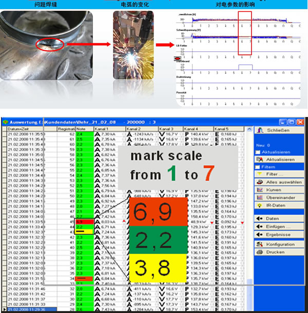 通過PFD(Pioneering Fault Detection)的在線焊接質(zhì)量探傷技術(shù)對(duì)焊接過程質(zhì)量進(jìn)行監(jiān)測(cè),可以對(duì)具體的焊接缺陷進(jìn)行智能的分析及探測(cè),并指出具體缺陷及發(fā)生的位置,如:氣孔、焊漏、電弧不穩(wěn)定及送絲不穩(wěn)定造成的質(zhì)量問題。